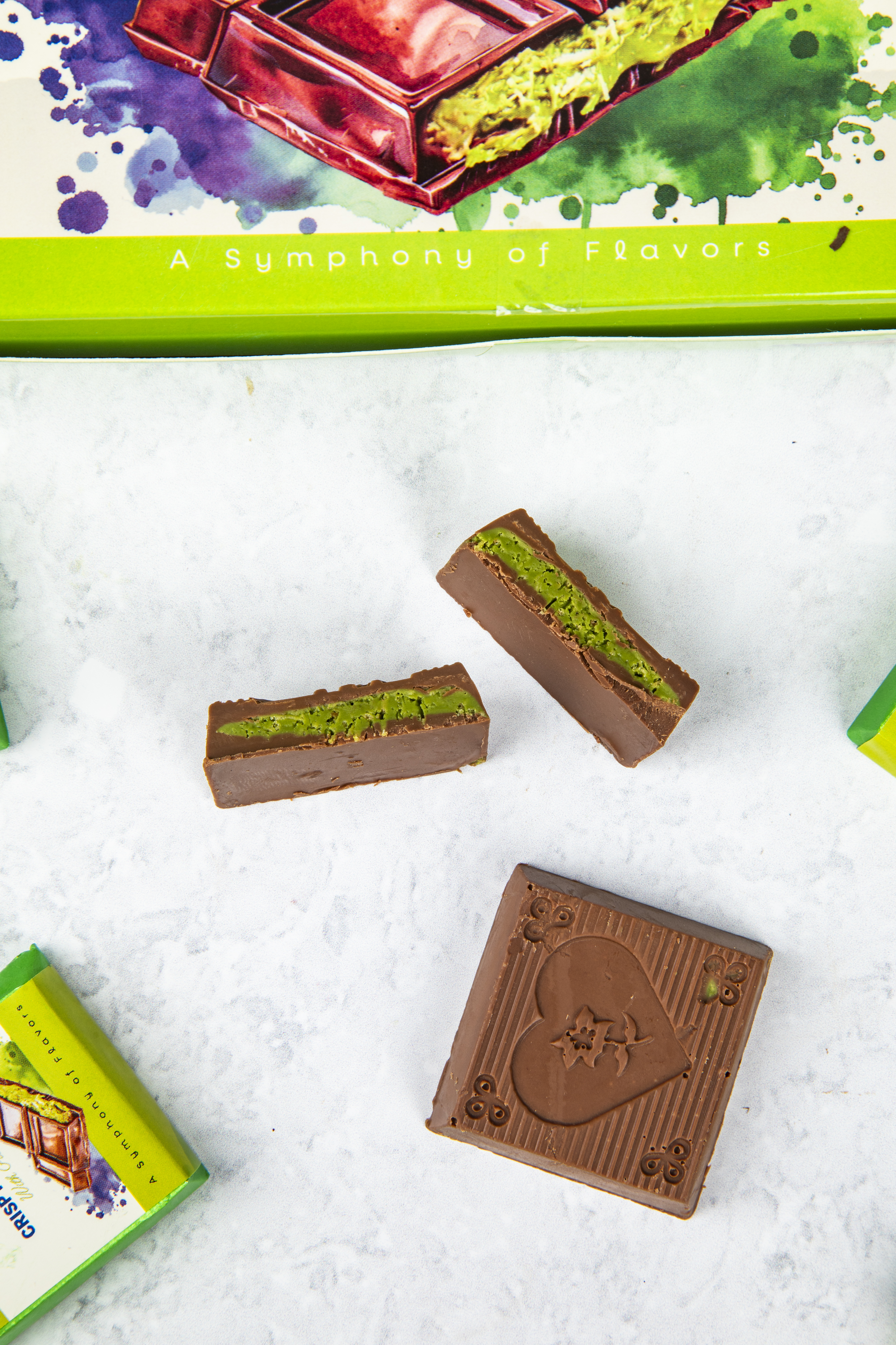 علبة تحتوي على 60 قطعة من الشوكولاتة الزيرو بحشوة البستاشيو الكنافة